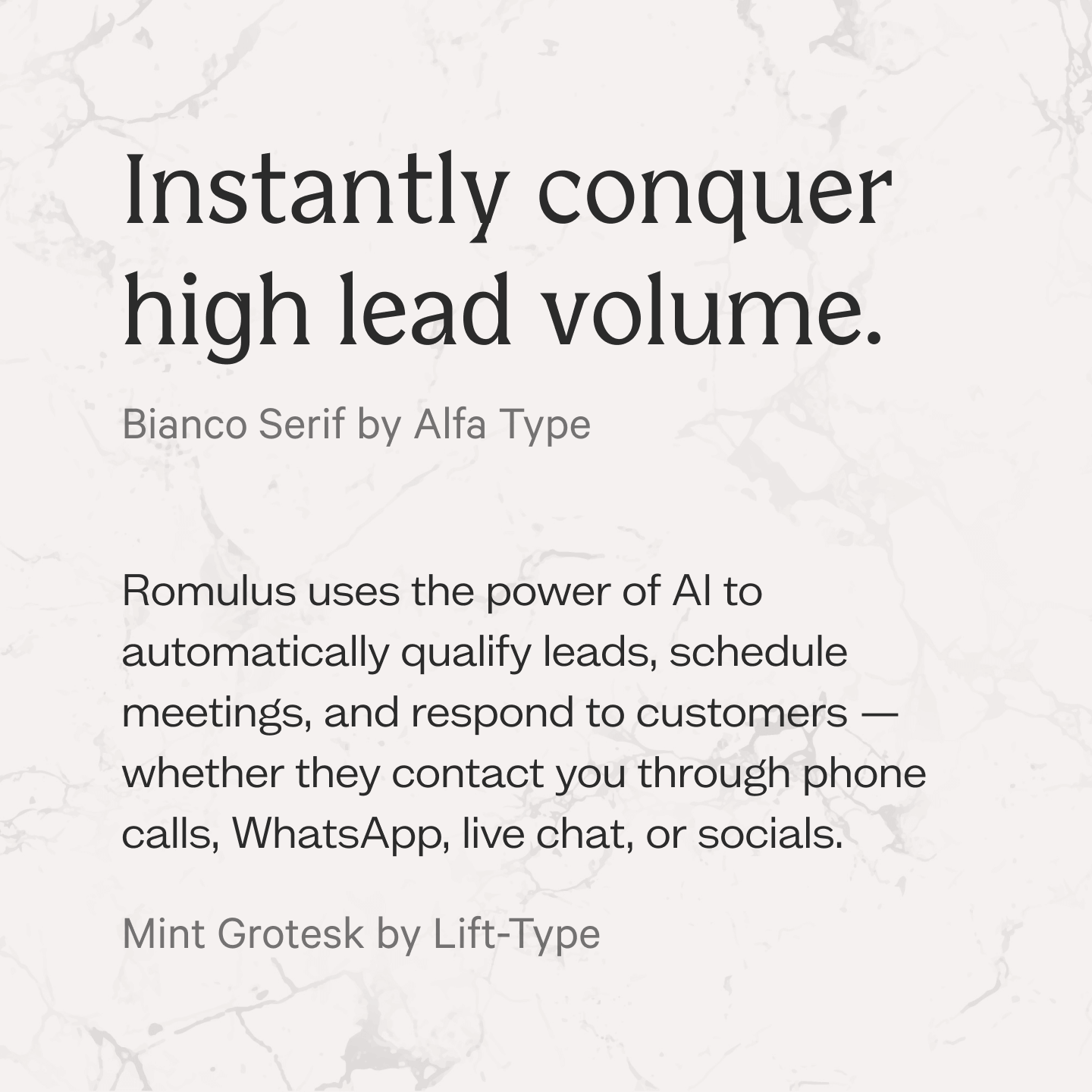 The name Romulus embodies the project’s ambition: like the first king of Rome, the product aims to expand a sales team’s power, multiplying its strength. Artificial intelligence becomes a legion of digital agents ready to simplify and enhance human work. The result is a brand with a strong, distinctive voice that conveys solidity and innovation as naturally as its agents speak on the phone.