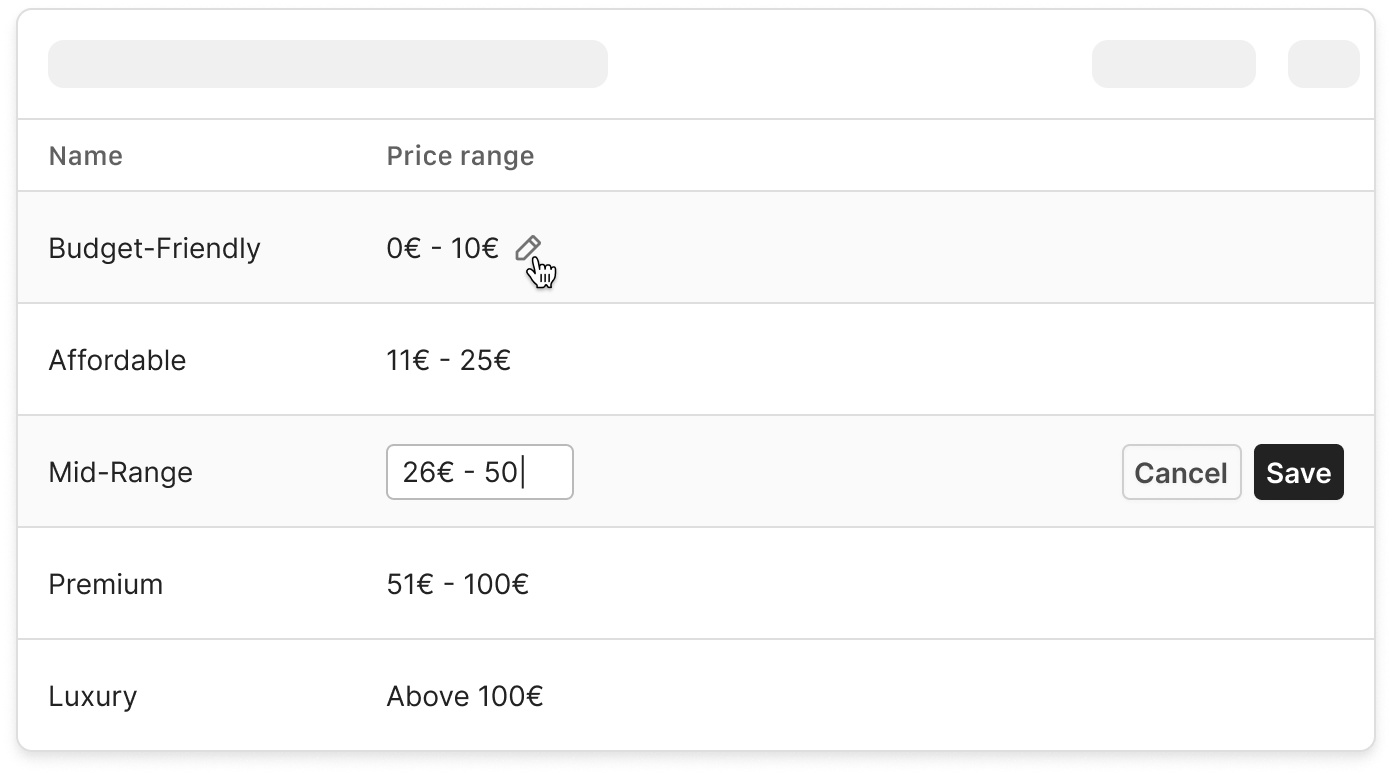 Le azioni di modifica di una singola riga devono essere poche e ben visibili, utilizzando icone riconoscibili per le azioni più comuni come la modifica, l’eliminazione e l’aggiunta di una nuova riga.
