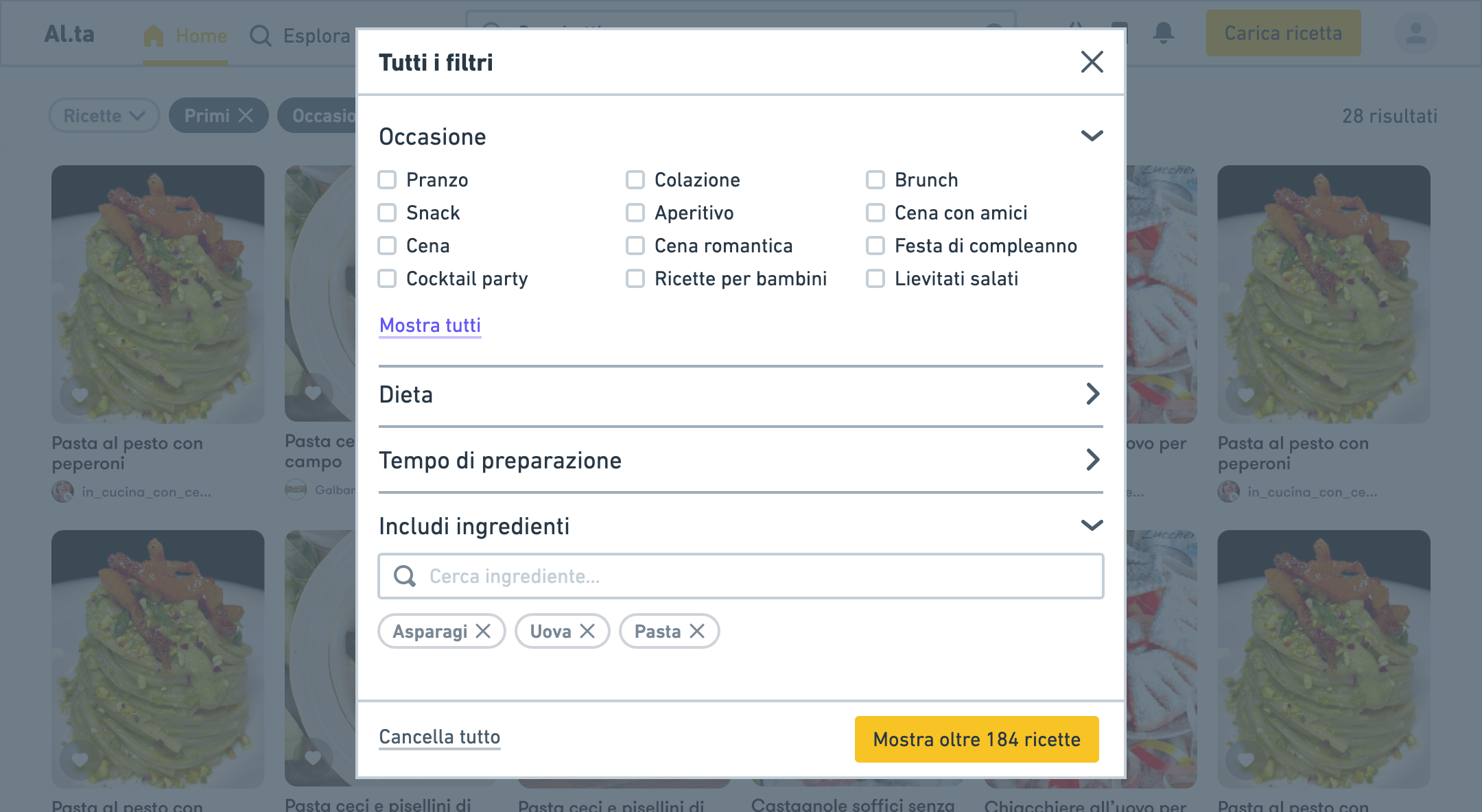 Avendo notato la crescente incidenza del traffico proveniente dai motori di ricerca, i fondatori di Al.ta Cucina ci hanno chiesto di affiancare il loro team tecnico nella creazione della nuova piattaforma web, con l’obiettivo di offrire ai loro utenti web la stessa esperienza di chi partecipa alla community tramite l’app mobile.