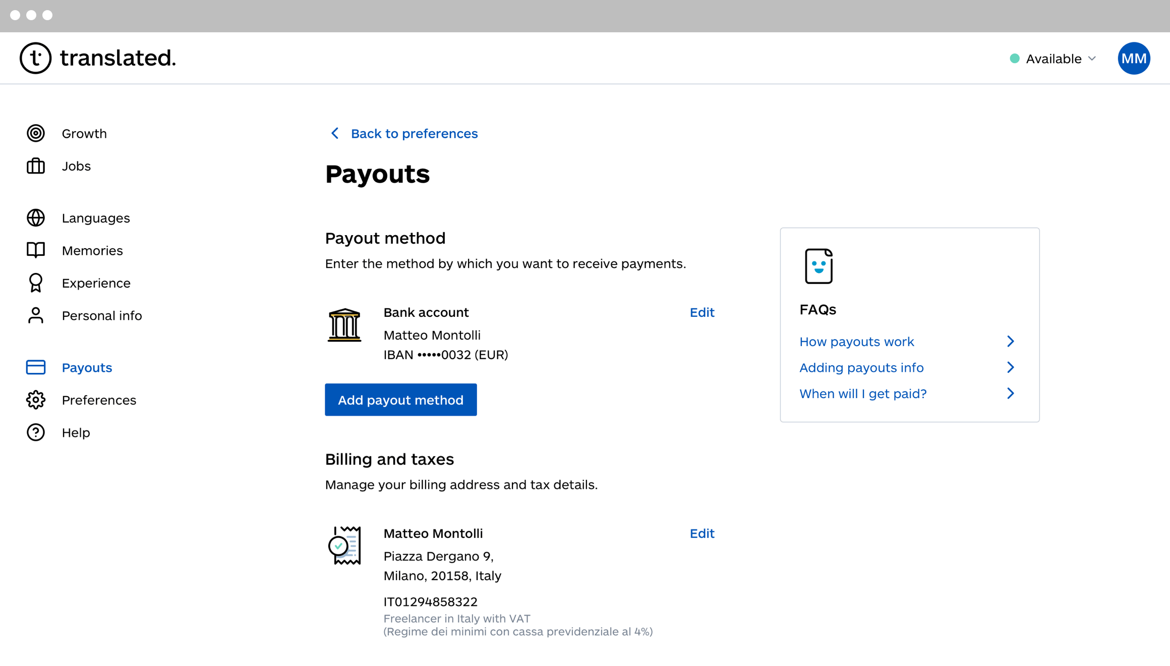 Era importante offrire al candidato una dashboard dove poter gestire tutte le informazioni riguardanti il suo rapporto con Translated. La sfida era far coesistere le funzionalità più basilari (come, ad esempio, l’aggiornamento delle proprie competenze o l’inserimento dei dati di fatturazione) con una sezione aspirazionale in grado di accompagnare costantemente la crescita del traduttore attraverso suggerimenti, contenuti formativi e altre informazioni personalizzate.