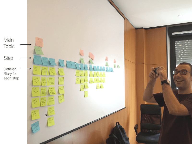 Story Mapping consists of describing a user’s journey step by step (from left to right, blue cards in the pic) with a detailed list of each step (from top to down, yellow cards in the pic).