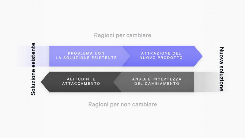 Il Jobs-to-be-done utilizza uno schema chiamato “Force Diagram” (schema di forze) per capire quali forze positive e negative influenzano i potenziali clienti nell’adozione di un nuovo prodotto.