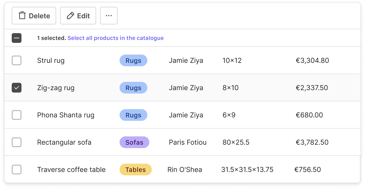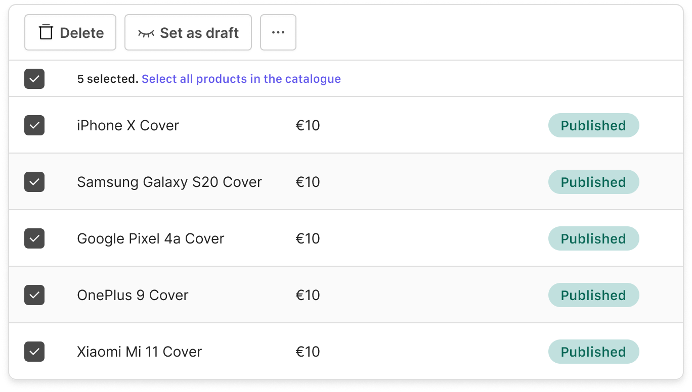 When working with large amounts of data, you often want to make the same change on several rows at once. For example, you might want to change the visibility of a number of products from an ecommerce site's catalog in one fell swoop. This can be done by selecting all relevant rows and changing the visibility at once. This feature saves time and avoids having to perform the same operation repeatedly on each individual row.