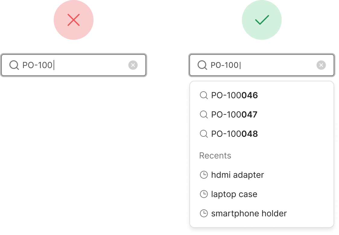 With regard to search, it is useful to provide suggestions and auto-completion to make it as easy as possible for the user, allow advanced search using filters, and provide clear visual feedback to signal the positive or negative outcome of the interaction.