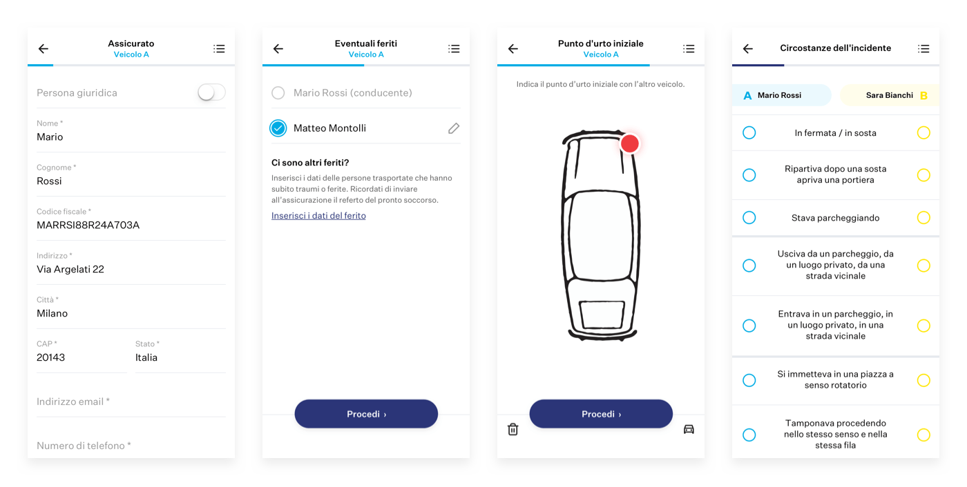 We have designed a User Experience that will ensure the customer feels guided through all the steps, thus enabling them to correctly fill out the accident report even in the event of severe stress due to a recently occurring traffic accident.
