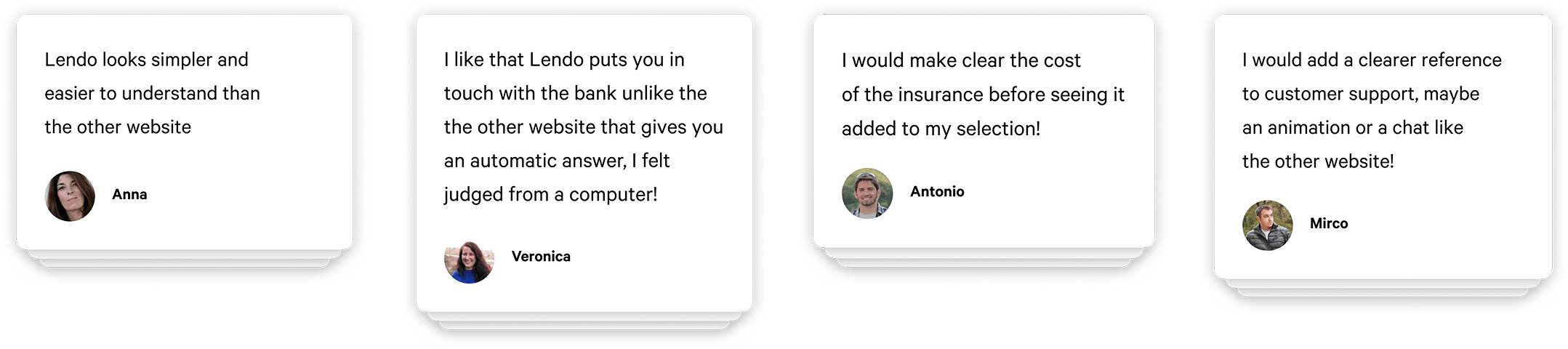 - User Testing on a prototype of Lendo’s Italian website and on the sites of the main competitors, to capture user reactions and help our client identify key opportunities for improvement and differentiation from competitors.