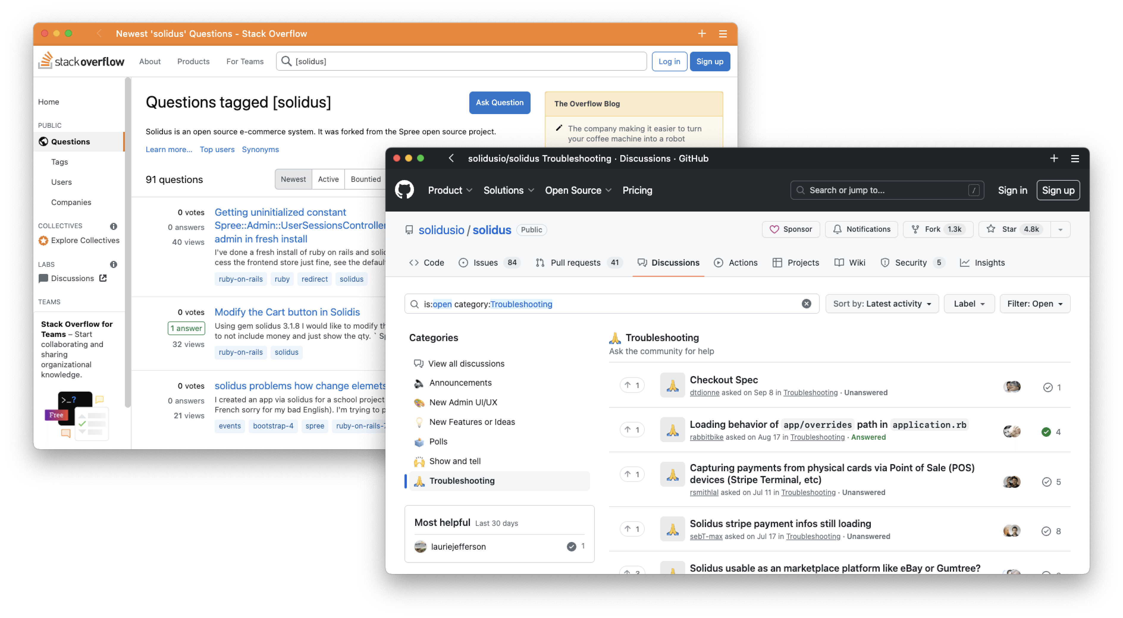 We conducted a round of stakeholder interviews involving key people from the Solidus core team, analyzed Solidus user interviews conducted by the team, and considered feedback left by community members on Slack, GitHub, and Stack Overflow.