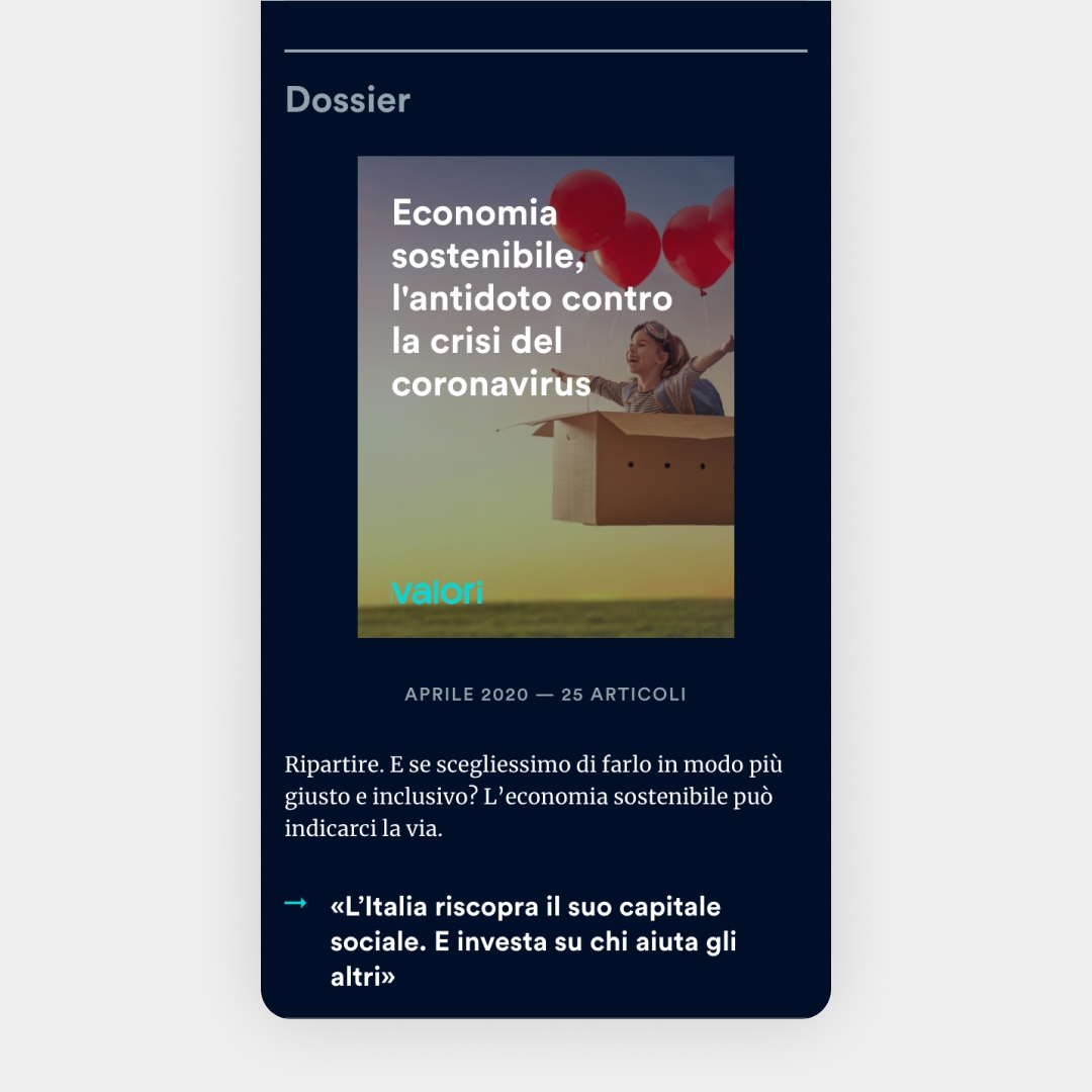 We have improved the layout of Valori’s dossiers to achieve pages with a strong visual impact, as traditionally happens for dossiers in print magazines. First of all, we wanted each dossier to have its own cover with title, image and logo.