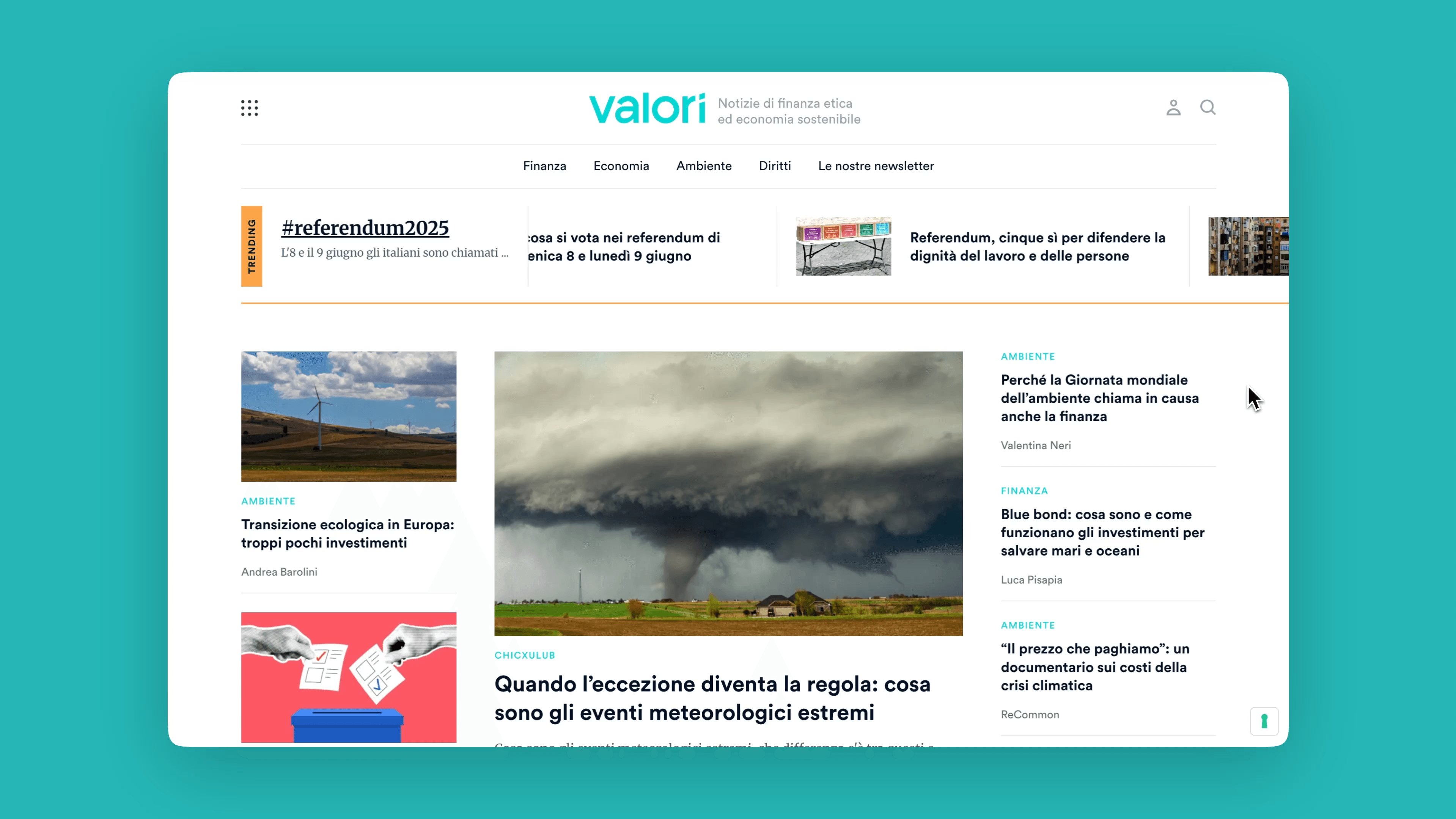 We investigated the reasons that drive users to read Valori and collected information on the quality of their experience in the context of financial data. By reconstructing the user experience, we developed hypothetical improvements that have fuelled the design process for Valori’s new website.